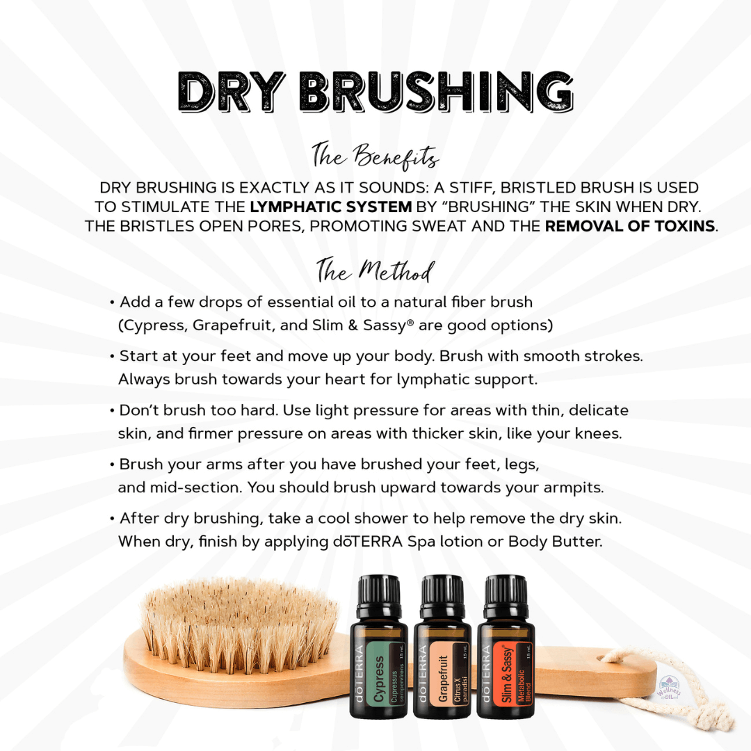 In case you haven't heard of dry brushing I wanted to touch on this one really fast. Dry brushing is fantastic for our lymphatic system. It helps to gently exfoliate the skin and promotes healthy circulation. Below you will find a few essential oils that are great to use when dry brushing and how to use this proactive healthcare method.