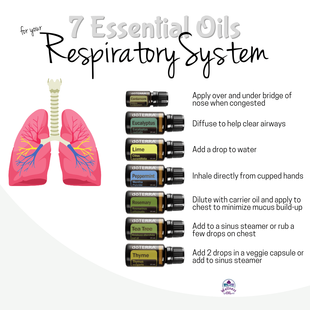 Respiratory System – consists of the network of organs and tissues that help you breathe. It basically acts as a filtration system allowing your respiratory system to move oxygen into the body while removing waste gases. When we breathe in, thousands of oxygen molecules travel through our nose and mouth, down the larynx and trachea, and into the lungs. Tiny appendages called cilia in our lungs secrete mucus as they move back and forth carrying dust and germs out of the lungs, which is expelled by sneezing, coughing, spitting or swallowing. Essential oils can support the respiratory system by easing symptoms caused by seasonal threats, soothe a scratchy throat, and minimize the effects of respiratory illnesses.