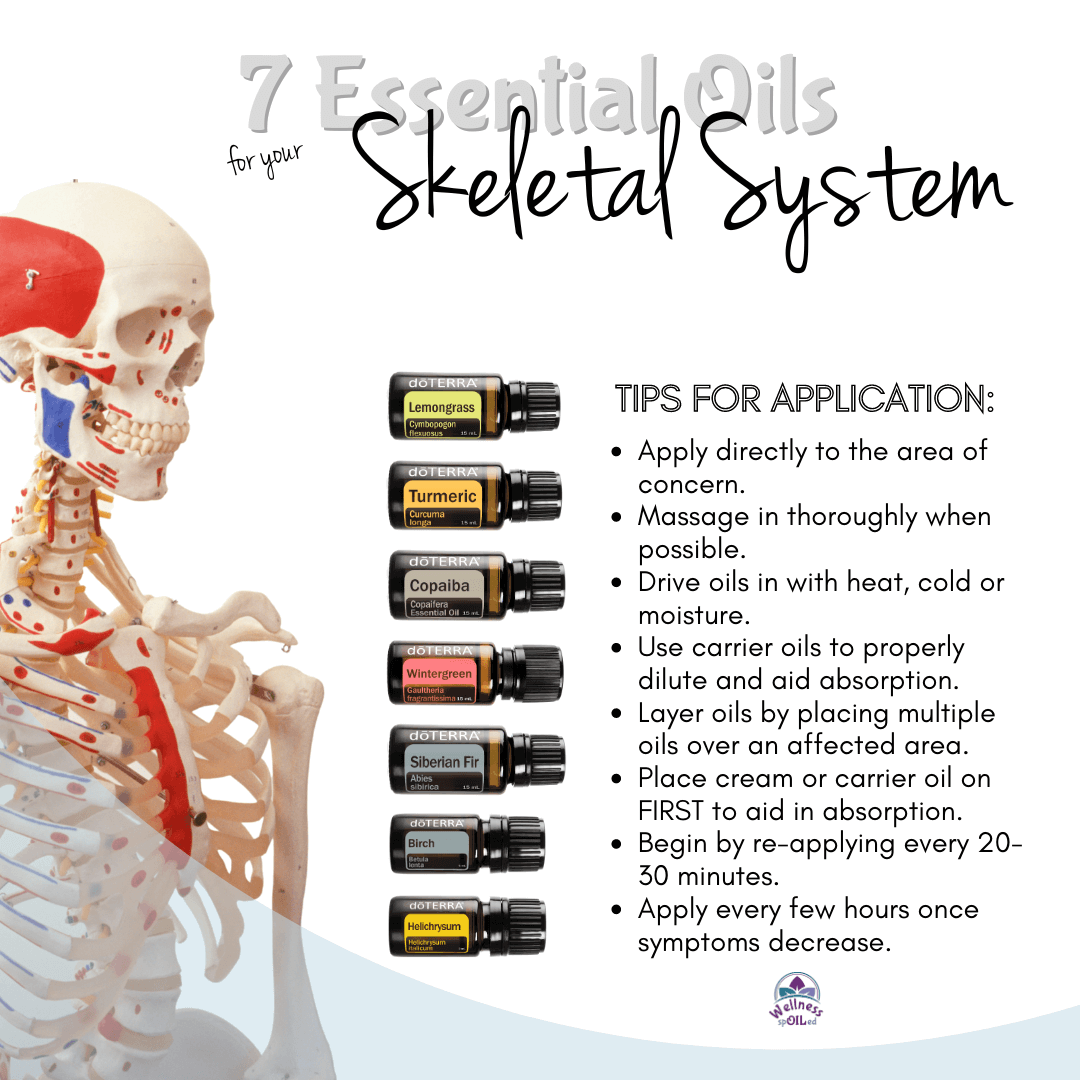 Skeletal System - consists of the framework for which all organs and tissues depend on for proper placement and coordination – our shape and protects your internal organs. The skeletal system accounts for about 20% of the body’s overall weight. When there is an injury in the skeletal system, the use of essential oils can support and expedite the healing process and recovery time.
