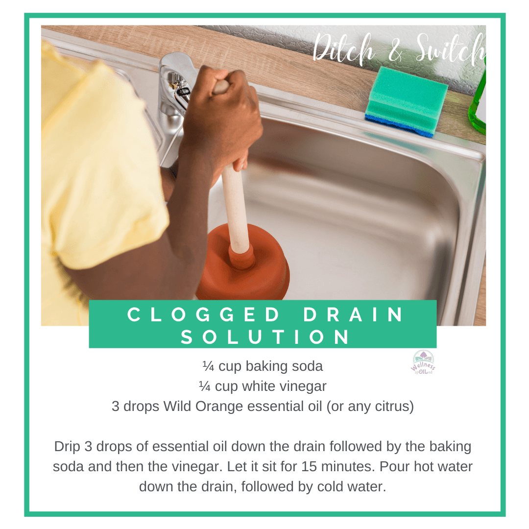 Drip 3 drops of essential oil down the drain followed by the baking soda and then the vinegar. Let sit for 15 minutes. Pour 2 cups boiling water down the drain, followed by cold water from the tap.