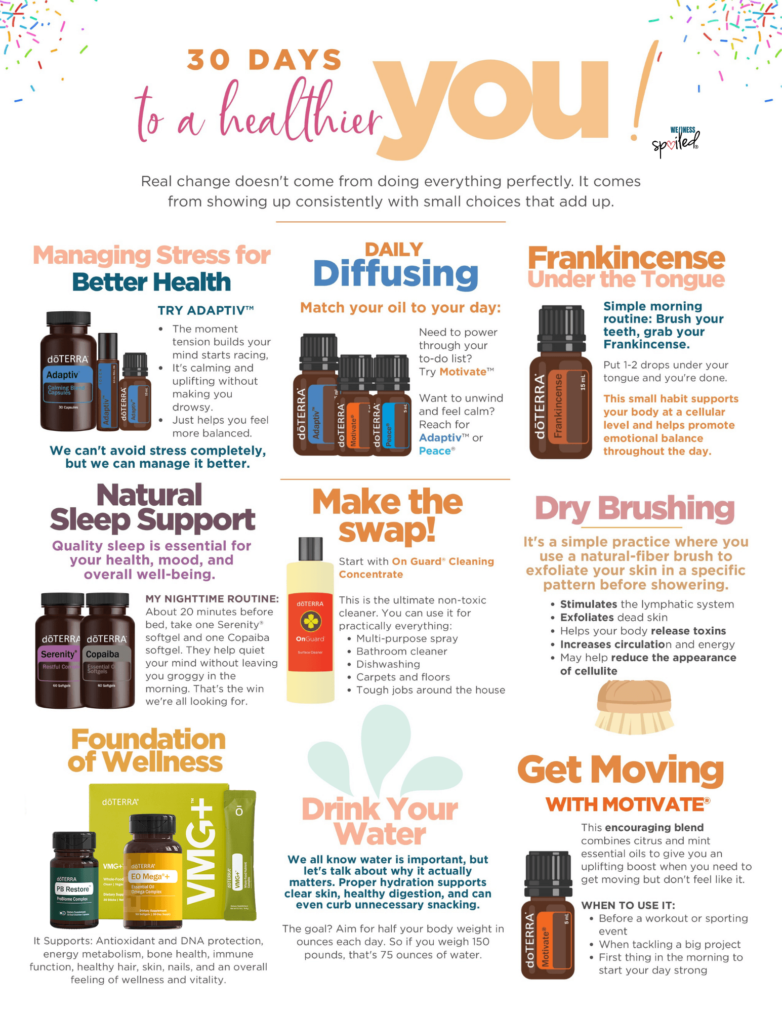 foundational wellness support includes doTERRA VMG+, EO Mega+, and PB Restore, which work synergistically to support overall health.